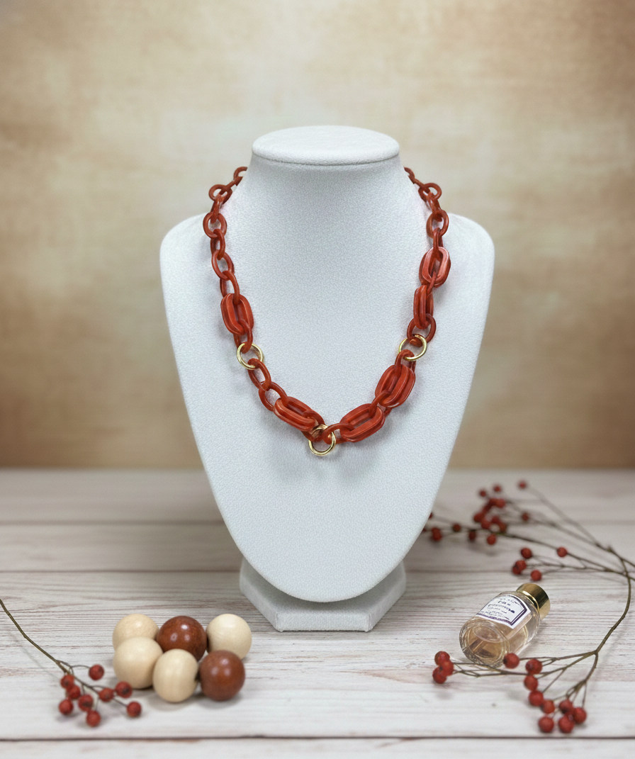This Terracotta Link Necklace masterfully combines a deep, earthy burnt-orange palette with polished gold-tone hardware. Featuring a rhythmic blend of smooth circular links and architectural elongated ovals, it creates a structured yet fluid silhouette. Designed for the modern woman who appreciates bold geometry, it effortlessly bridges the gap between vintage-inspired charm and contemporary chic.